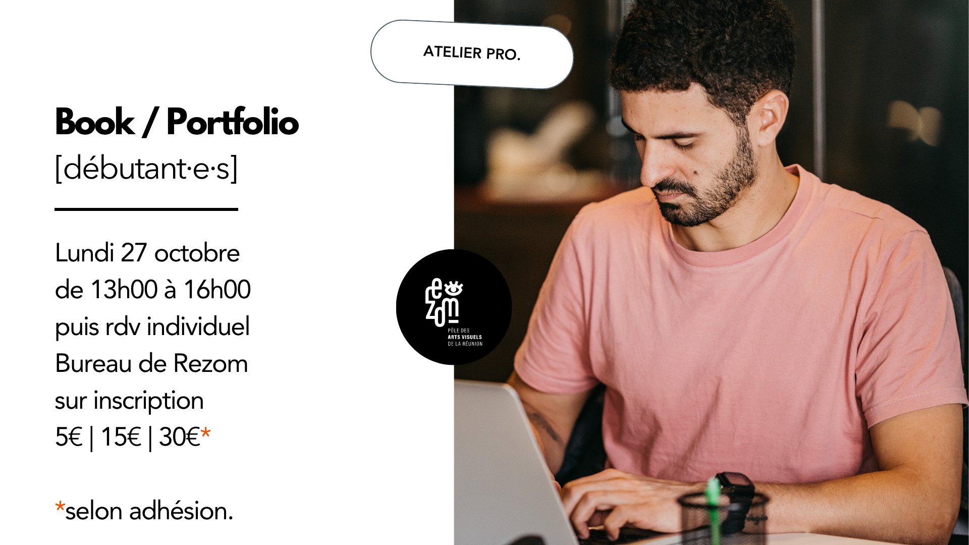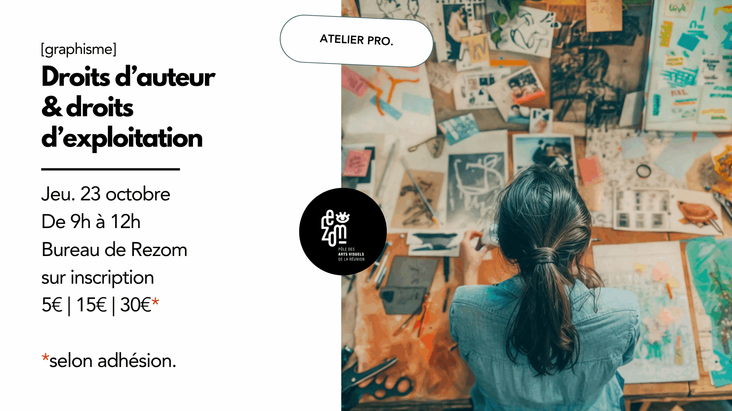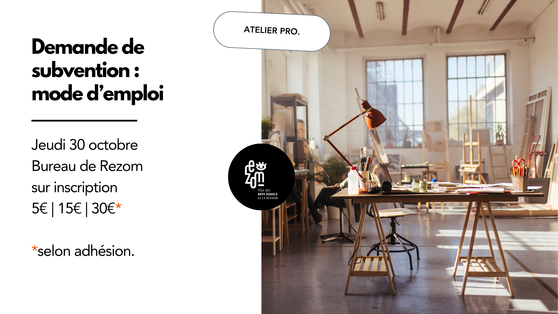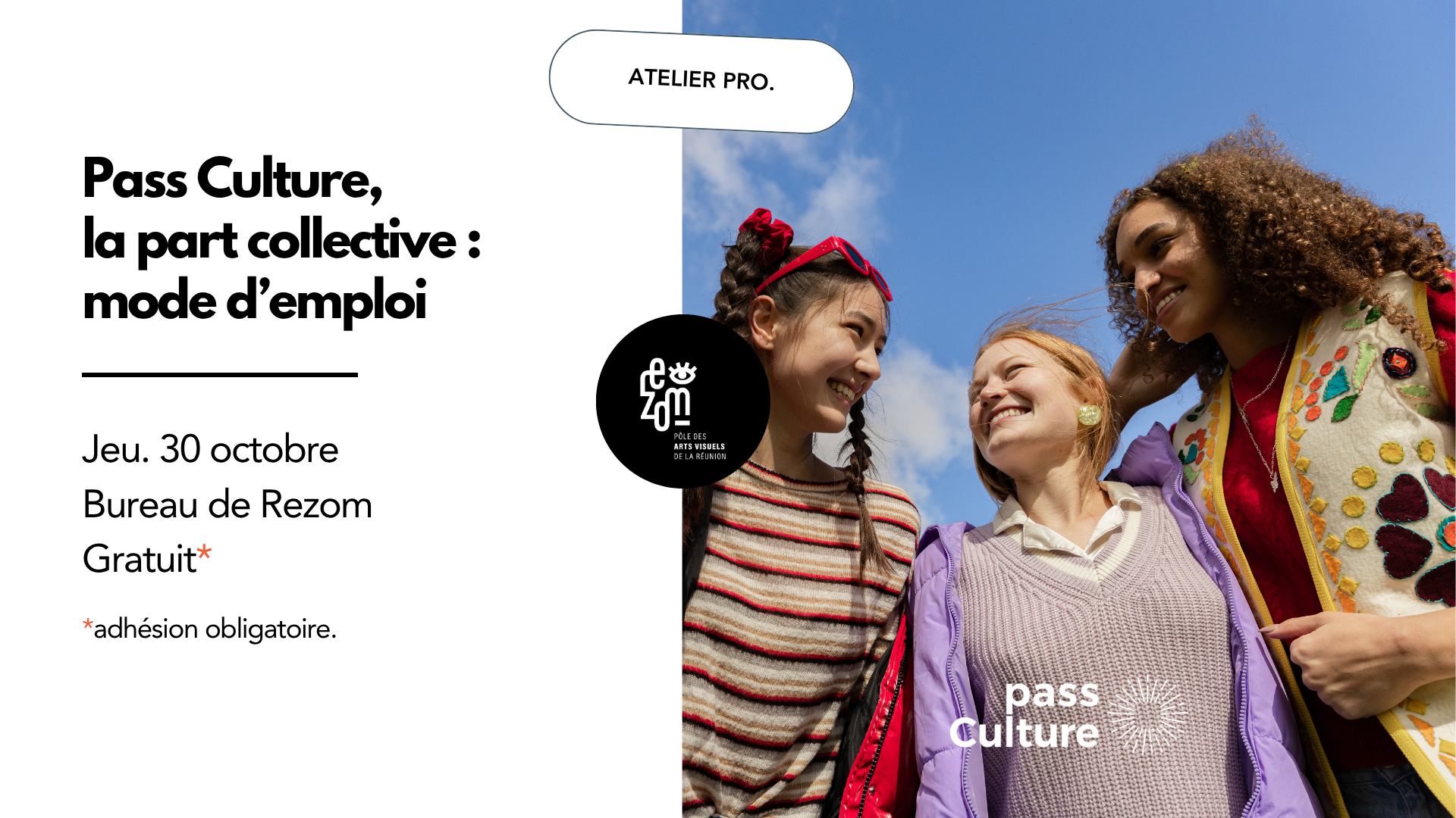 Objectif de l'atelier Présentation du volet collectif du pass Culture Focus sur la création d'offres collectives Pour qui ? Ouvert aux membres de Rezom, sur inscription par mail : contact@rezom.re ou par téléphone : 06 93 82 52 59 Gratuit, adhésion obligatoire.